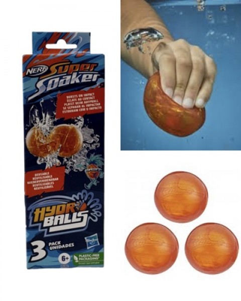 R Hydro Balls Nerf Super Soaker Badespielzeug 3er-PackDie weichen Bälle Ø 5,5 cm bestehen aus zwei Hälften und zerplatzen beim Aufprall. Kinderleicht können sie danach wieder zusammengesetzt und wiederverwendet werden.