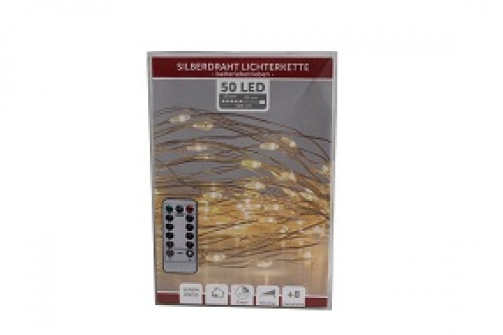 Produktinformationen "W Lichterkette Draht 50er mit Timer, 8 Funktionen, mit FB, batterieb."